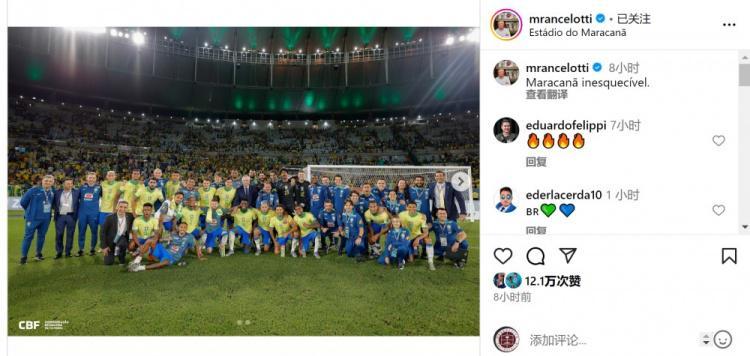 巴西队主帅安切洛蒂更新社媒动态,晒出球队的大合照,配文:“难忘的马拉卡纳。”